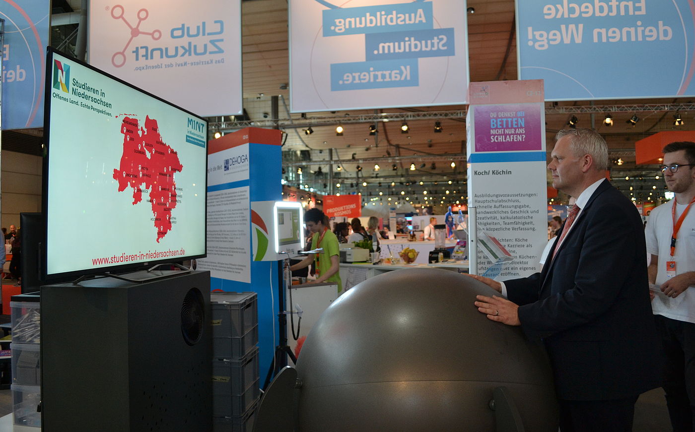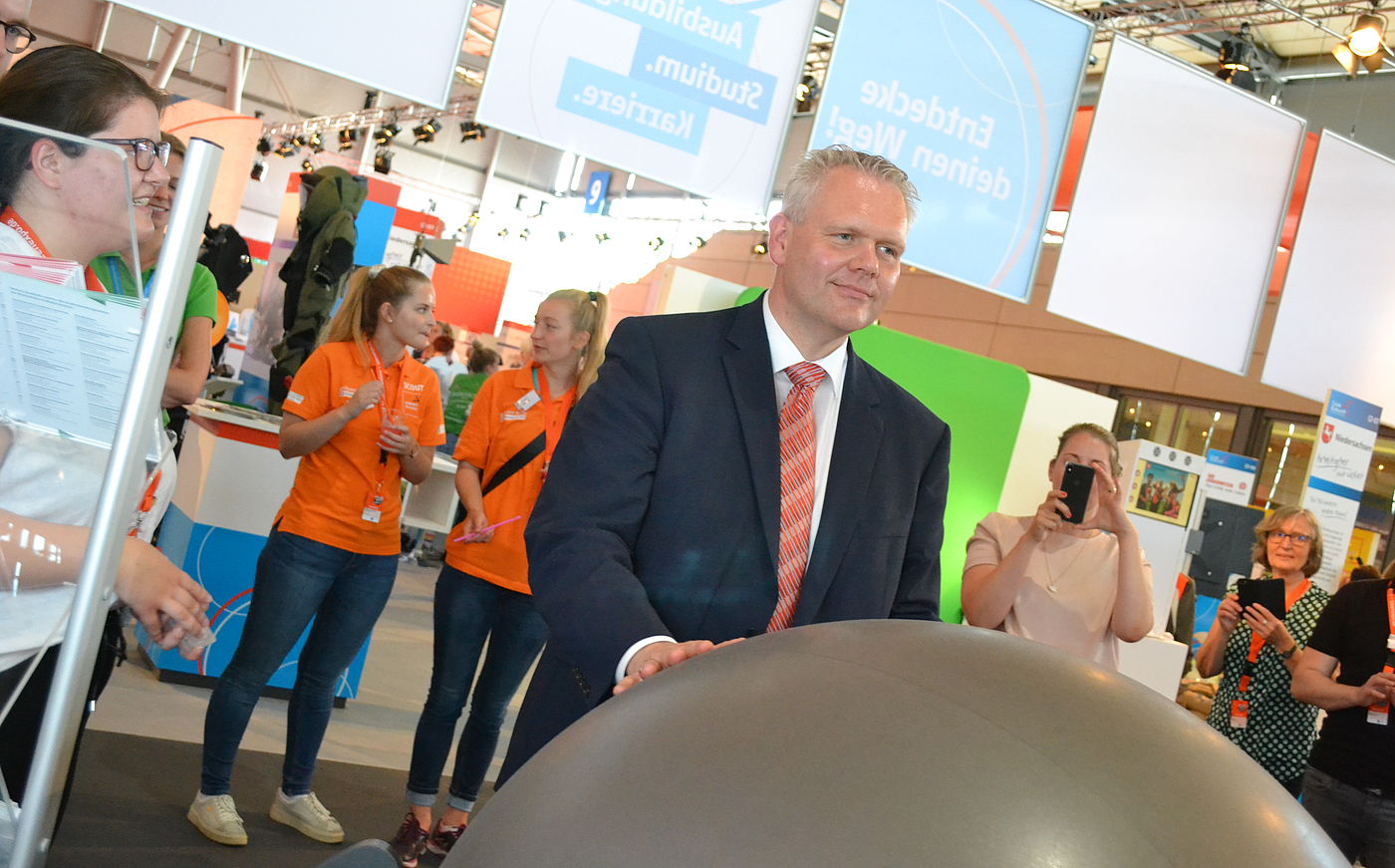 Die Mitmach-Messe in den Hallen 9, 8, 7 und erstmals auch Halle 6 war größer als je zuvor. Auf 110.000 Quadratmetern stellten rund 270 Unternehmen, Verbände, wissenschaftliche Einrichtungen, Hochschulen und Schulen ihre Exponate vor. Im "ClubZukunft" gab es Informationen und Angebote zur Studien- und Berufsorientierung, zu Ausbildungsberufen, akademischen Bildungswegen und Freiwilligendiensten. Am Hochschul-Gemeinschaftsstand von "Studieren in Niedersachsen" standen die Studienberaterinnen und Studienberater der niedersächsischen Hochschulen für unabhängige und qualifizierte Beratung zur Verfügung. Frei nach dem IdeenExpo-Motto "Mach doch einfach" hatten wir mit dem Sisyfox-Spiel ein virtuelles Mitmach-Exponat dabei, das vollen Körpereinsatz erforderte und für jede Menge Spielspaß gesorgt hat. Dabei ging's rund!