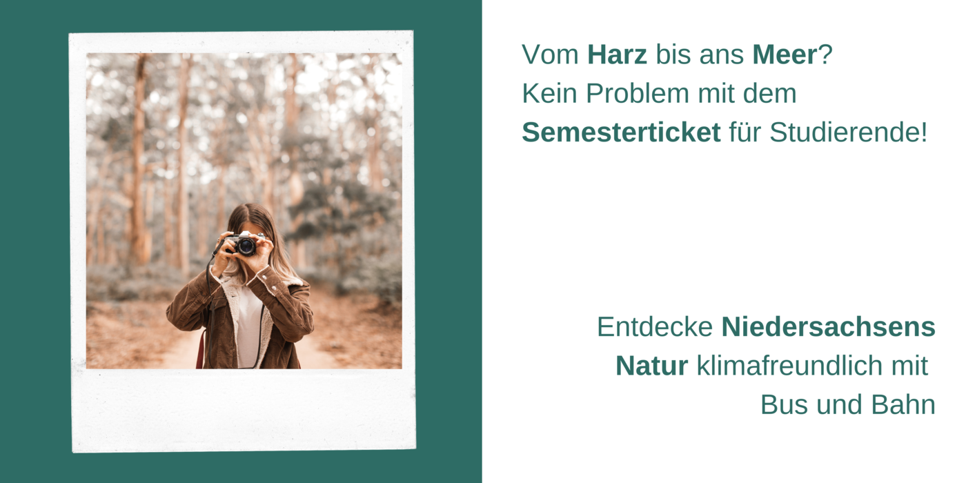 Eine junge Frau fotografiert im Wald, dazu der Text: Vom Harz bis ans Meer? Kein Problem mit dem Semesterticket für Studierende! Entdecke Niedersachsens Natur klimafreundlich mit Bus und Bahn