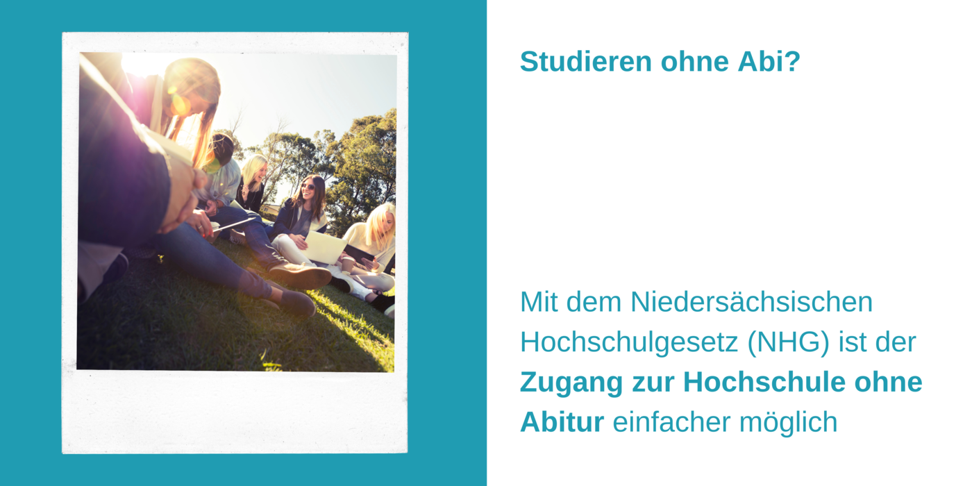 Eine fröhliche Gruppe junger Menschen sitzt auf einer Wiese und arbeitet gemeinsam an mehreren Laptops, dazu der Text: Studieren ohne Abi? Mit dem Niedersächsischen Hochschulgesetz (NHG) ist der Zugang zur Hochschule ohne Abitur einfacher möglich