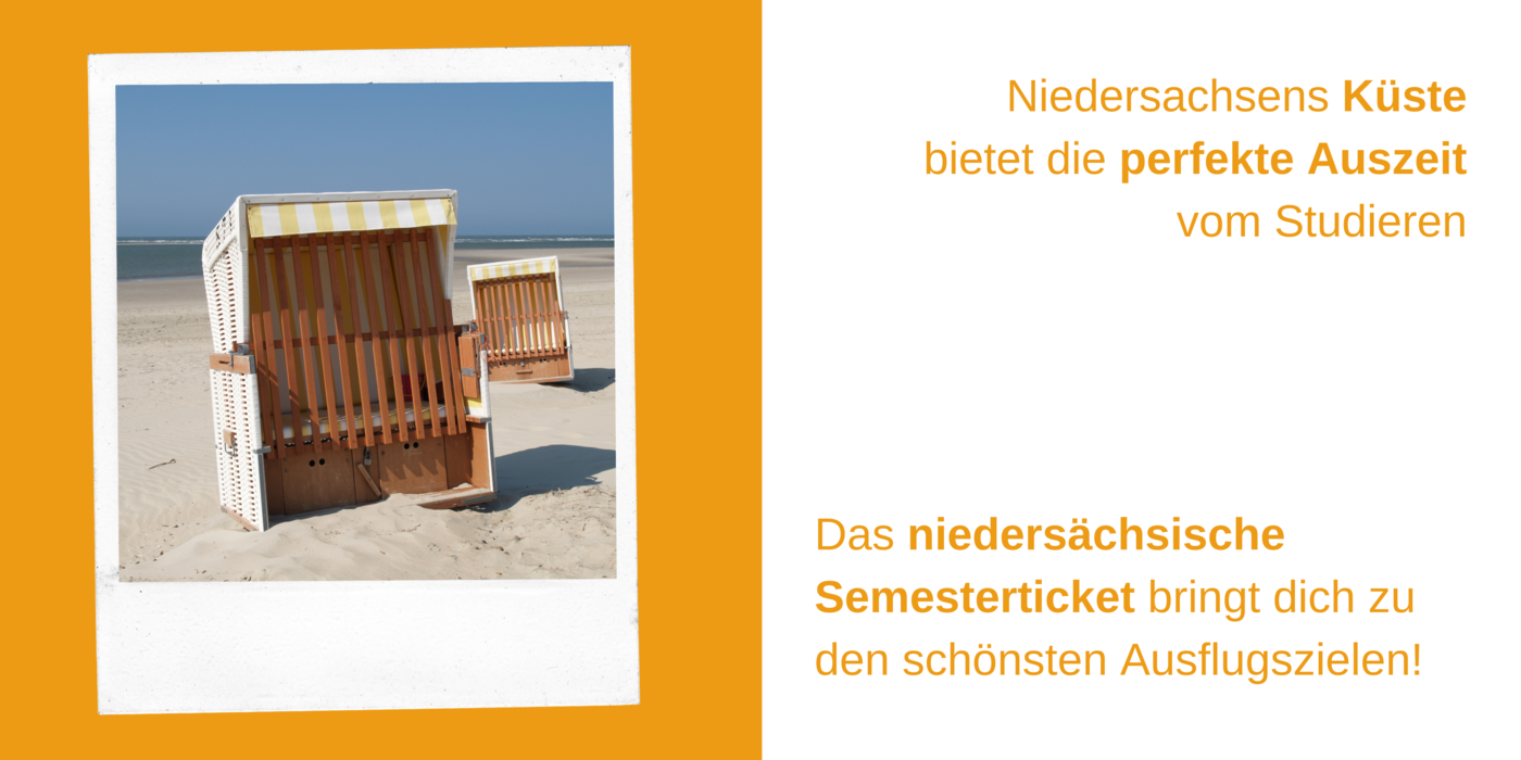 Strandkörbe am Meer, dazu der Text: Niedersachsens Küste bietet die perfekte Auszeit vom Studieren. Das niedersächsische Semesterticket bringt dich zu den schönsten Ausflugszielen!