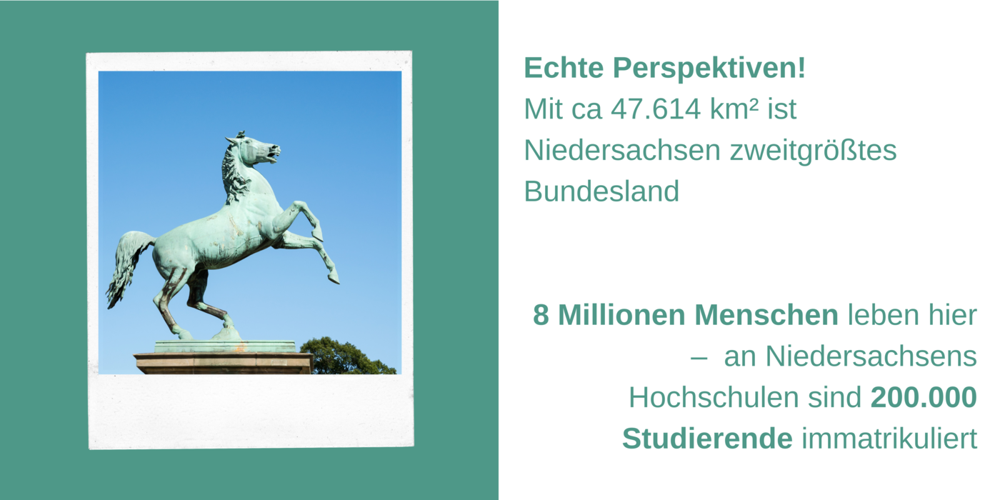Statue des Niedersachsenross', dazu der Text: Echte Perspektiven! Mit ca. 47.614 km² ist Niedersachsen zweitgrößtes Bundesland. 8 Millionen Menschen leben hier – an Niedersachsens Hochschulen sind 200.000 Studierende immatrikuliert