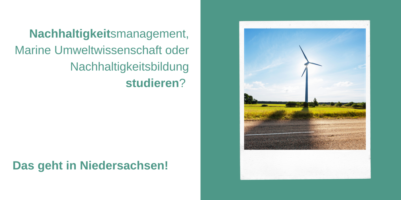 Windrad vor blauem Himmel, dazu der Text: Nachhaltigkeitsmanagement, Marine Umweltwissenschaft oder Nachhaltigkeitsbildung studieren? Das geht in Niedersachsen!