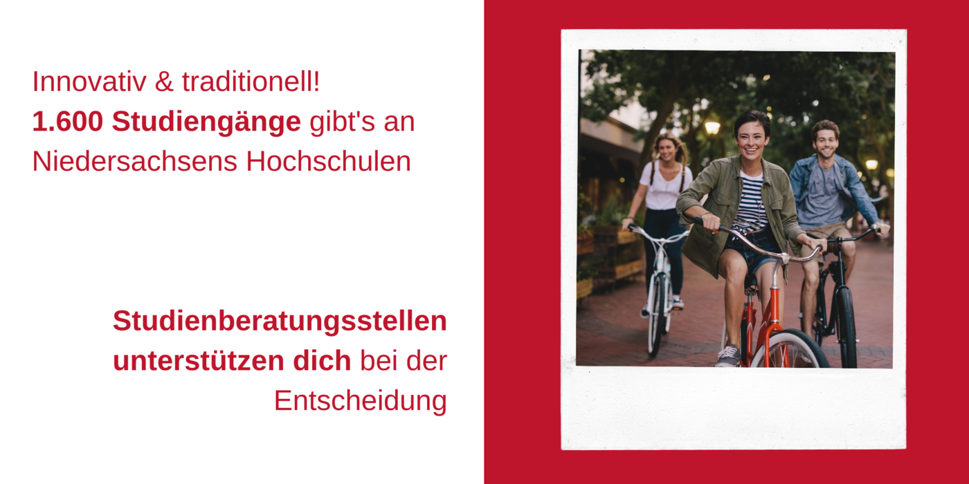 Fahrradfahrende junge Menschen, dazu der Text: Innovativ & traditionell! 1.600 Studiengänge gibt’s an Niedersachsens Hochschulen. Studienberatungsstellen unterstützen dich bei der Entscheidung