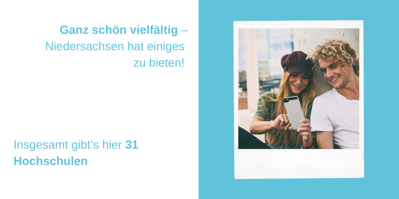 Zwei junge Menschen betrachten fröhlich ein Smartphone, dazu der Text: Ganz schön vielfältig – Niedersachsen hat einiges zu bieten! Insgesamt gibt’s hier 31 Hochschulen