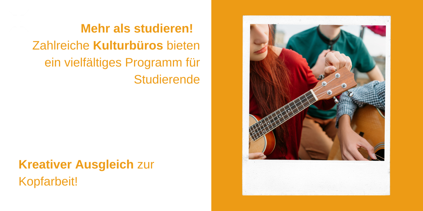 Mehrere Menschen spielen gemeinsam Gitarre, dazu der Text: Mehr als studieren! Zahlreiche Kulturbüros bieten ein vielfältiges Programm für Studierende. Kreativer Ausgleich zur Kopfarbeit!