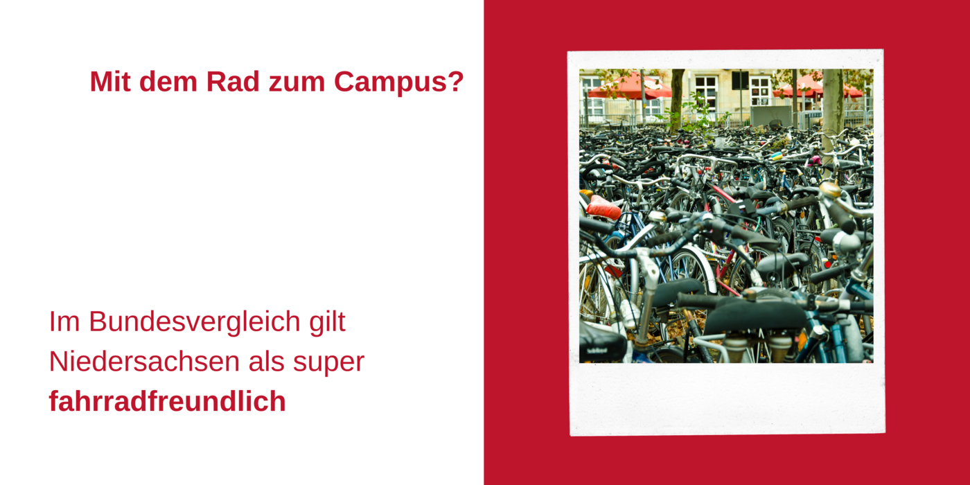 Viele Fahrräder auf einem großen Platz, dazu der Text: Mit dem Rad zum Campus? Im Bundesvergleich gilt Niedersachsen als super fahrradfreundlich