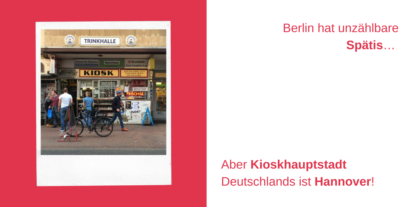 Ein Kiosk mit viel Kundschaft, dazu der Text: Berlin hat unzählbare Spätis… Aber Kioskhauptstadt Deutschlands ist Hannover!