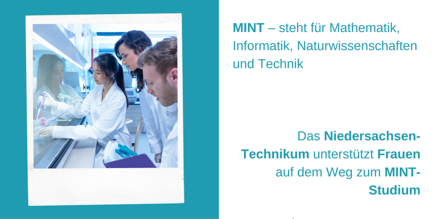 Junge Menschen in einem naturwissenschaftlichen Labor, dazu der Text: MINT – steht für Mathematik, Informatik, Naturwissenschaften und Technik. Das Niedersachsen-Technikum unterstützt Frauen auf dem Weg zum MINT-Studium