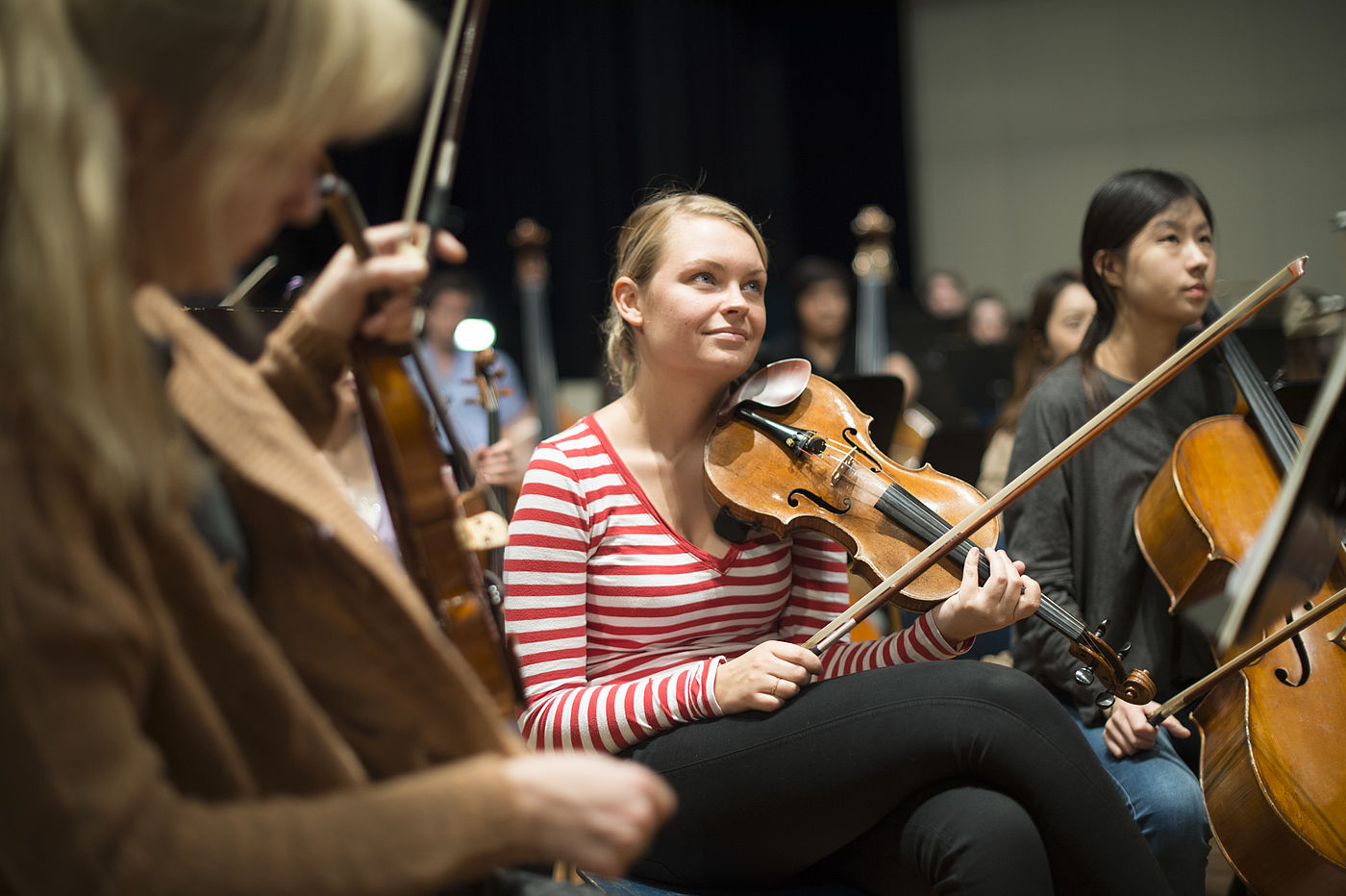 Studierende mit Streichinstrumenten bei einer Orchesterprobe an der HMTM Hannover