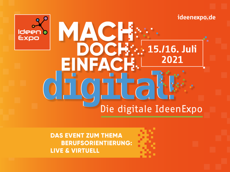 Europas größtes Jugend-Event für Naturwissenschaften und Technik wird virtuell: Unter dem Motto "Mach doch einfach!" findet die IdeenExpo erstmals als Online-Live-Veranstaltung statt. Und wir sind dabei: Studieren in Niedersachsen ist mit dem Gemeinschaftsstand der niedersächsischen Hochschulen auf der virtuellen Ausstellungsfläche vertreten. Also vormerken, anmelden, und online mitmachen: Die digitale IdeenExpo findet am 15. und 16. Juli 2021 statt.