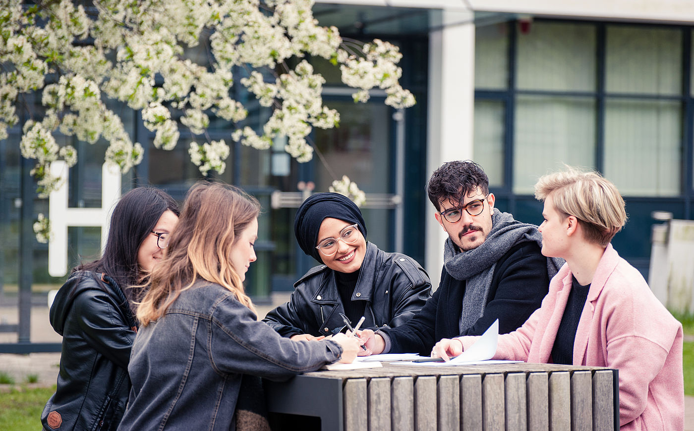 Studierende der HS Hannover sitzen vor dem Hochschulgebäude zusammen