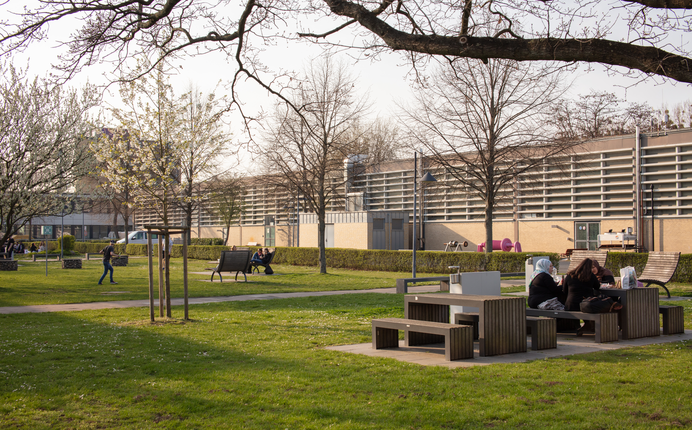 Studierende der HS Hannover sitzen im grünen Innenhof vor dem Hochschulgebäude zusammen