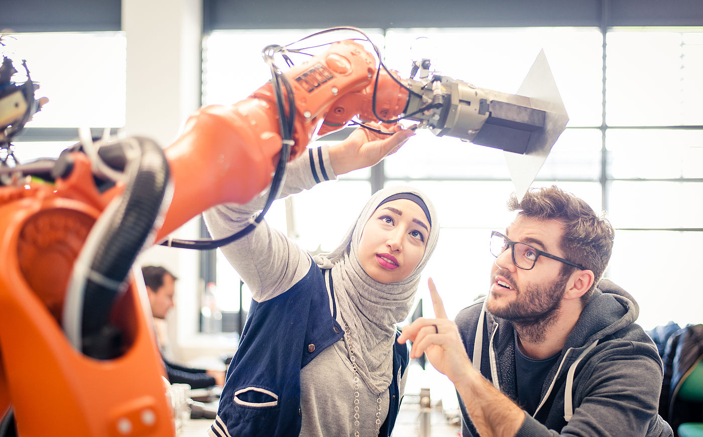 Zwei Studierende der HS Hannover arbeiten an einem großen Roboter
