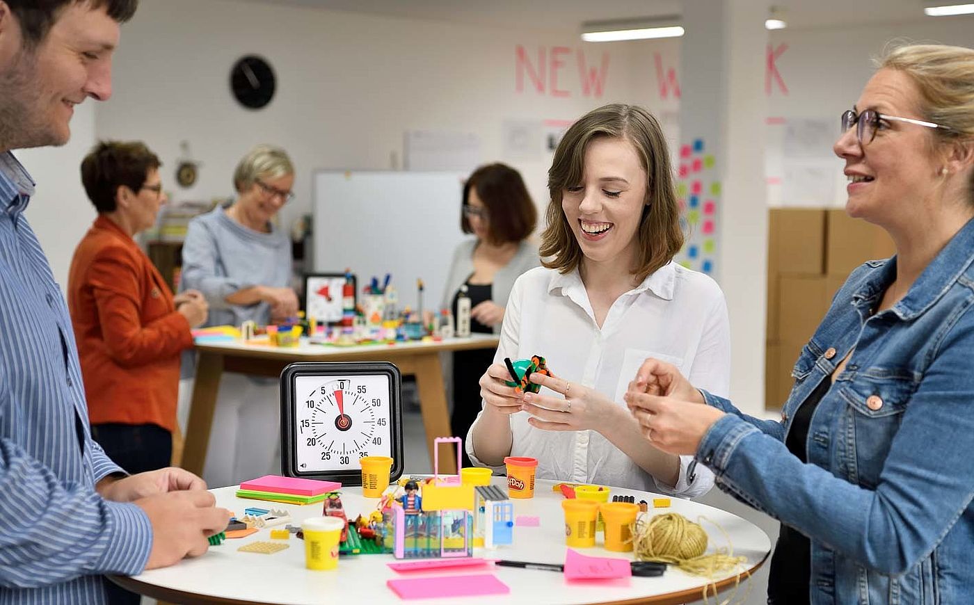 Studierende der HS Weserbergland sitzen an studentischen Arbeitsplätzen zusammen