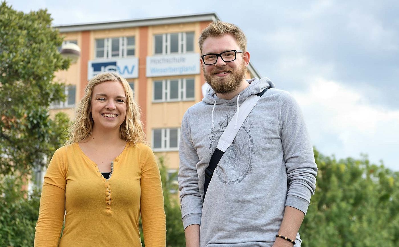 Zwei Studierende vor dem Hochschulgebäude der HS Weserbergland