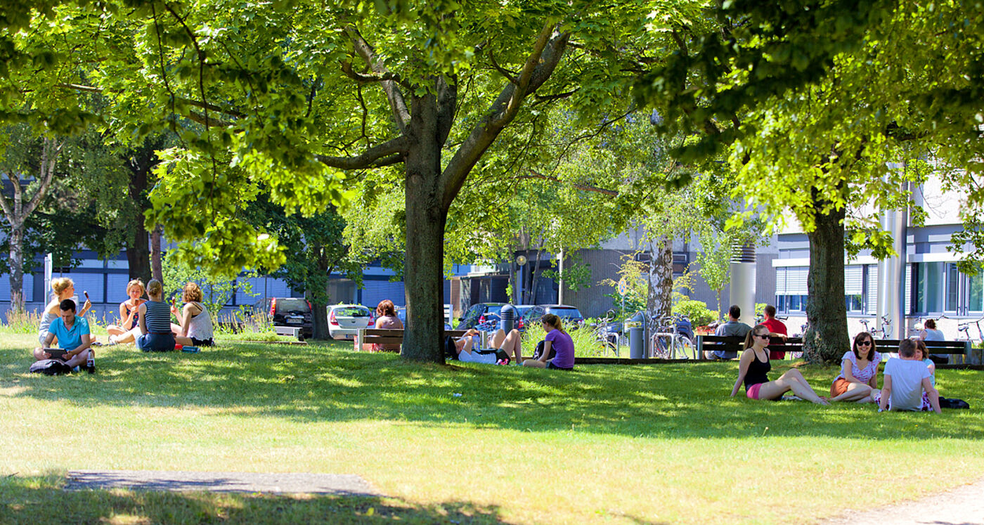 Studierende sitzen im Sommer auf der Wiese vor dem Hochschulgebäude der MHH zusammen