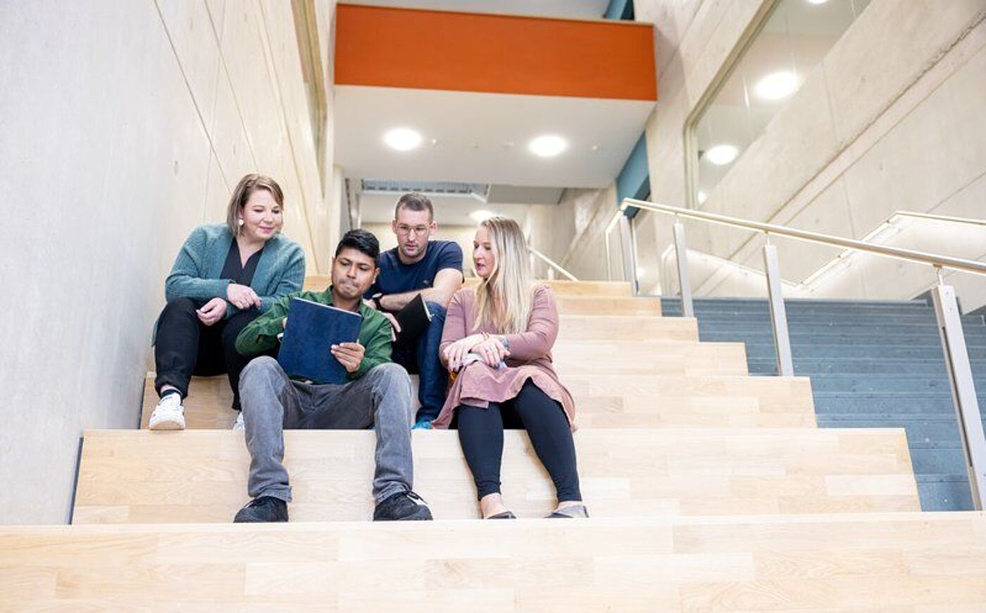 Studierende der Ostfalia HAW sitzen vor dem Hochschulgebäude zusammen